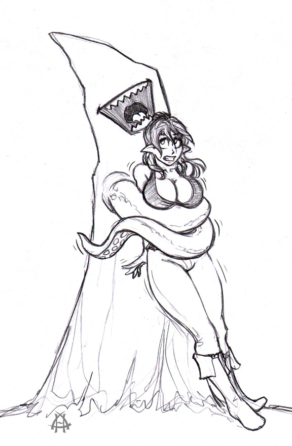 Week 30 “No Escape”: Another “Alternate Universe” pic. In this one, unfortunately, Bree was not able to convince the Moonblade to help her out against the Arachnodaemon, and she can only struggle helplessly as the demon spider settles down to a well-earned meal. |